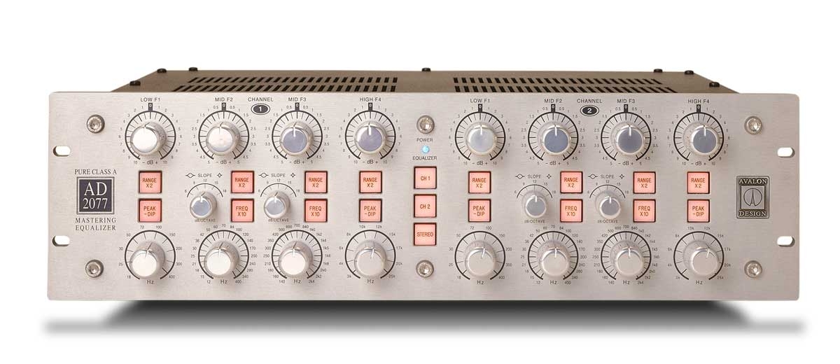The AD2077 mastering equalizer is an ultraistic design optimizing absolute signal integrity. Design features include 100% discrete pure class A signal amplifiers, state-of-the-art passive and active filter topologies and a DC coupled minimalist signal path. These unique designs offer the professional mastering engineer alternate tone selections in both filter domains while delivering the highest resolution and wide dynamic range with very low noise. Custom gold rotary switches give accuracy in 0.5dB, 1dB and 2dB steps. 104 switched frequencies per channel with X I0 range selectors provide frequency selections from 12Hz to 25kHz at 1/4 octave intervals. The Avalon AD2077 mastering equalizer is the most musically transparent analog EQ available today!